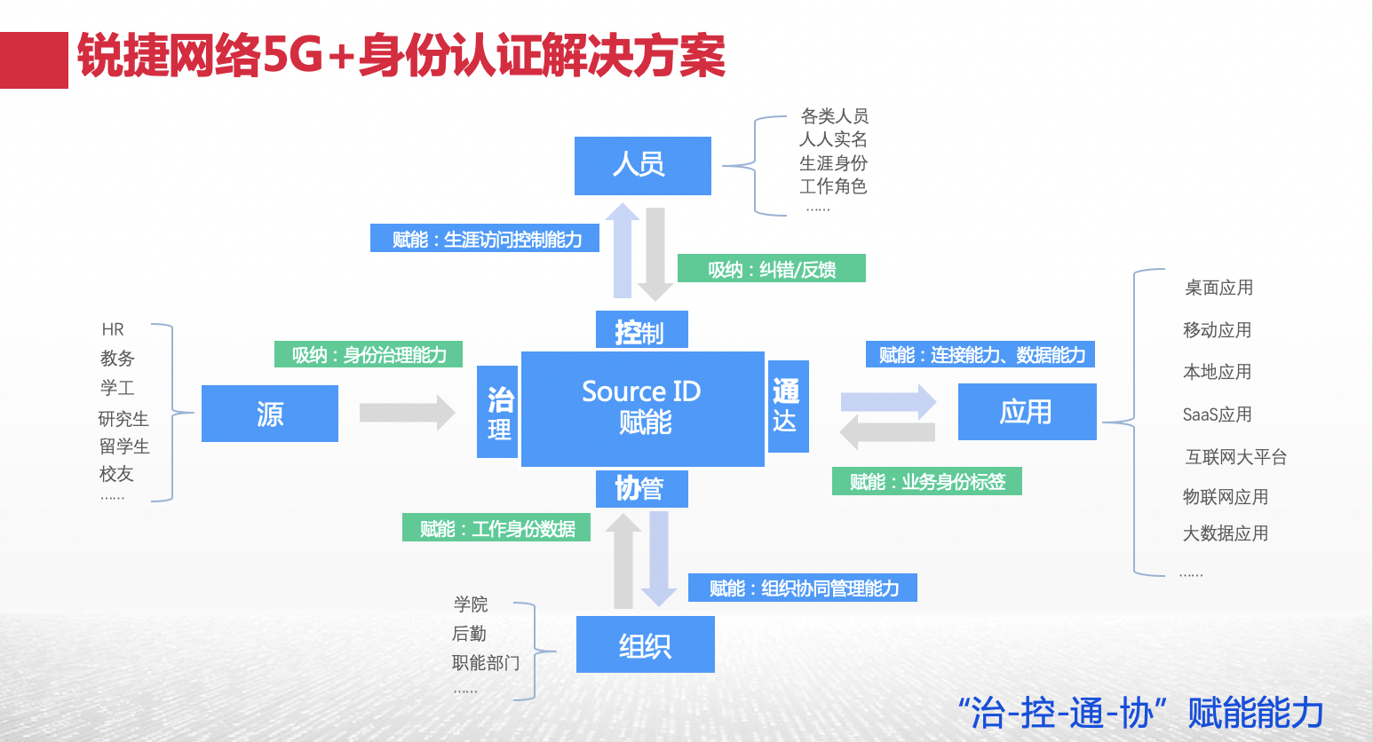5G环境下,校园用户身份管理问题越加复杂:人员生涯化多组织重叠,校内接入人员类型越来越丰富、变化频繁,Face ID等新ID出现挑战传统ID管理方式,访问环境也呈现多入口趋势,权限划分更加精细,国家政策对安全也更加重视。这都给校园网的用户管理带来了全新挑战。尊龙时凯通过SourceID 5G校园专网认证方案,实现全人员全生涯身份治理,全入口校园网权限管控,全链路网络实名审计,构建生涯访问控制体系,搭建生涯数据快速交付通道。通过大数据为业务进行精准业务身份标签,提升连接能力、数据能力、组织协同管理能力,提供更多的便捷访问服务。