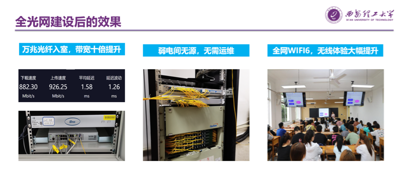 西安理工大学的以太全光网建成后,建设效果得到了广大师生的认可,在教学区通过万兆入室,带宽提升了十倍以上,通过实地测速,单端口速率达到了900兆,同时弱电间无源后,也大大降低了运维压力。全网的Wi-Fi 6更是让智慧教室等新业务应用体验,得到了大幅改善。