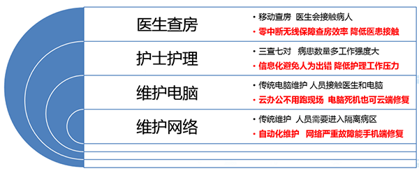 利用无线移动方式实现医生查房,可确保各项数据实时准确,同时将远程医疗系统终端向病区、ICU和患者床旁延伸,更好地支撑后方专家对救治一线的远程医疗,降低医护接触、减少感染机会。