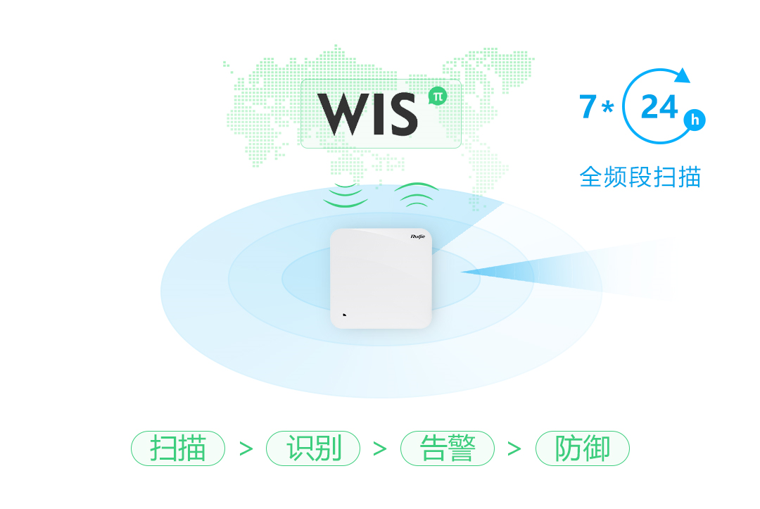 Wi-Fi 6 Plus+WIS构建一套扫描->识别->告警->防御的联动机制,使公共网络安全可视可知可防御,使可疑威胁无处匿藏。
