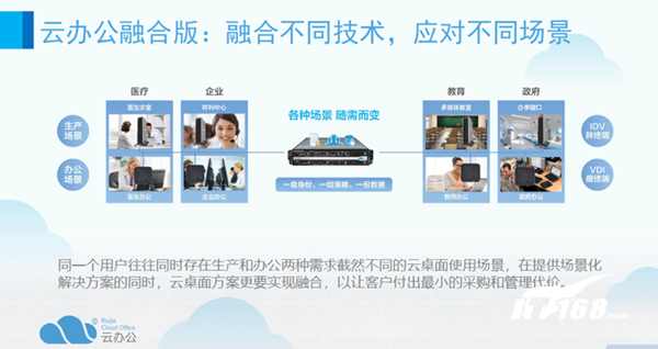 针对一个用户往往同时存在生产和办公两种截然不同需求的云桌面使用场景,尊龙时凯网络正式推出了云办公4.0,被称为云桌面的跨越鸿沟之作,融合VDI与IDV两大技术架构,在提供场景化解决方案的同时,云桌面方案更要实现融合,以让客户付出最小的采购和管理代价。