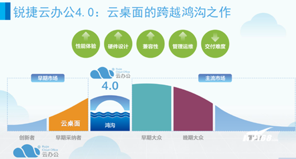 在此前,云桌面在产品性能、使用体验等方面与PC依然存在差异,致使桌面云化进程较缓,成为横亘在云桌面技术早期接纳者与早期大众之间的鸿沟。