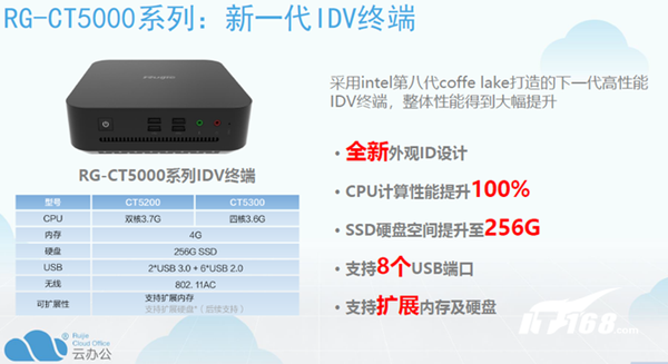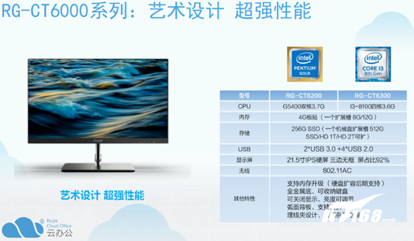 云办公4.0在硬件实现升级,RG-CT5000系列作为新一代IDV终端,采用Intel第八代coffe lake处理器,整体性能得到大幅提升,追平主流商用PC性能,同时RG-CT6000系列一体机产品具备可收纳底座、关闭屏幕显示按钮(午休息屏)等设计。