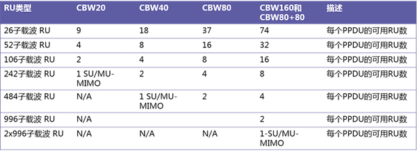 OFDMA结构由26子载波RU,52子载波RU,106子载波RU,242子载波RU,484子载波RU和996子载波RU组成。 下图中显示了最大RU数,RU位置取决于信道带宽。