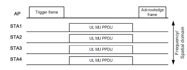 MU-MIMO和OFDMA技术可以同时使用。为了启用上行链路MU传输,AP发送称为触发帧的新控制帧,其包含用于STA的RU分配调度信息,用于基于触发的PPDU中每个STA的编码类型和调制与编码方案(MCS)。另外,触发帧为上行链路传输提供同步。