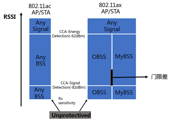 当802.11ax STA使用基于颜色代码的CCA规则时,它们也可以与发射功率控制一起调整OBSS信号检测阈值。此调整可提高系统级性能和频谱资源的使用。此外,802.11ax STA可以调整CCA参数,例如能量检测级别和信号检测级别。